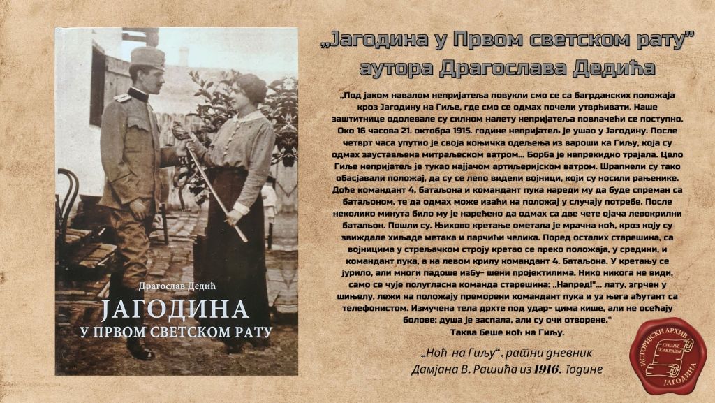 Издање књиге „Јагодина у Првом светском рату“ је у тврдoм повезу у издању Историјиског архива „Средње Поморавље“ Јагодина, цена књиге је 1500 динара.